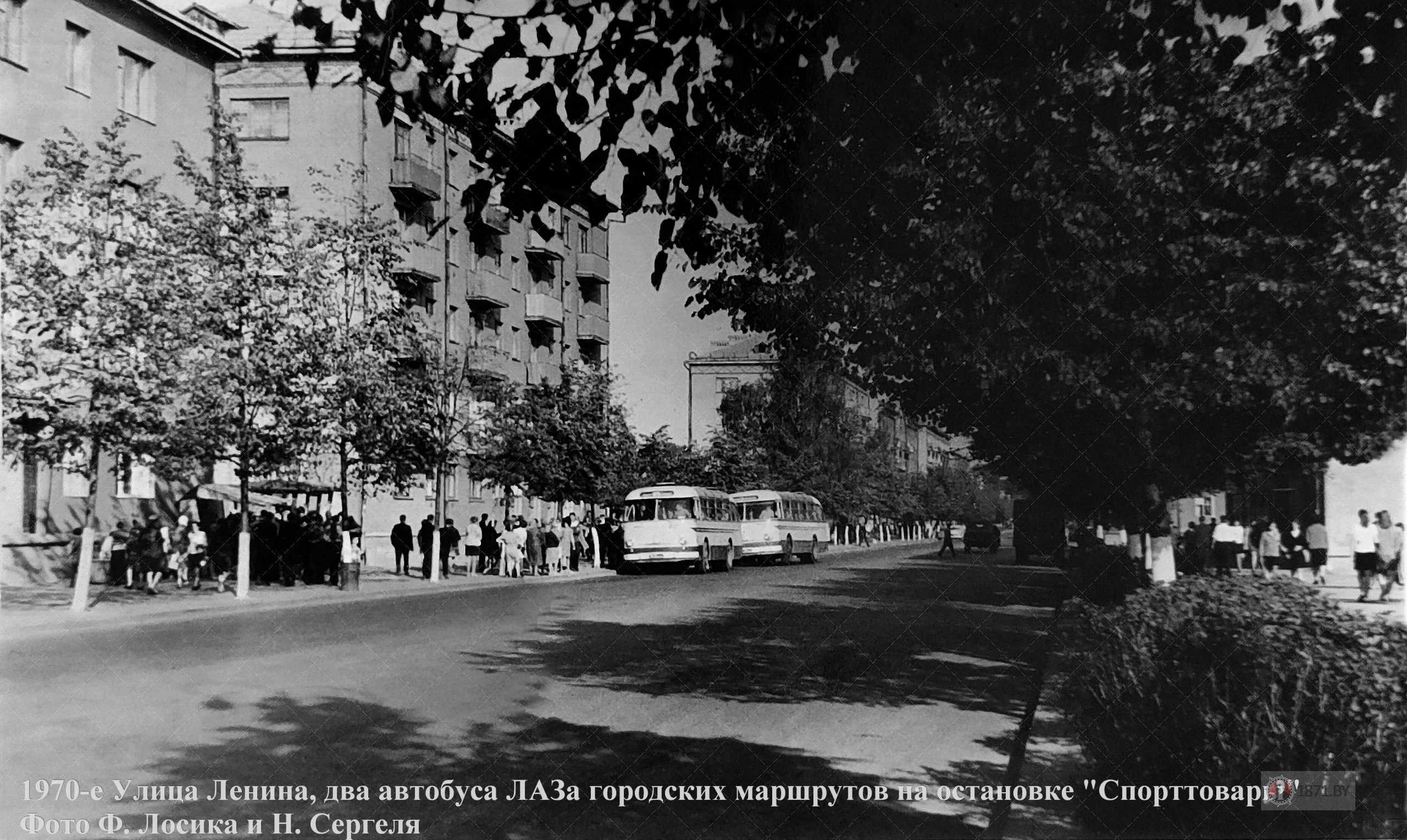 1970-е. Ул. Ленина, два ЛАЗа на остановке "Спорттовары" на карте Барановичи